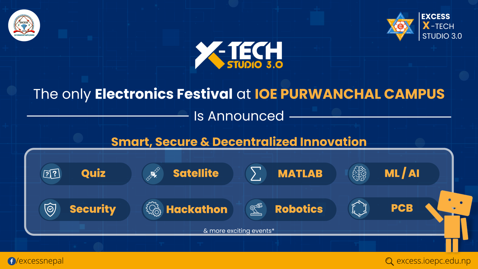 Electronics, Communication and Information Engineering Students Society ( EXCESS ) at IOE Purwanchal Campus is going to organize one of the biggest Tech Fest of the East “X-Tech Studio 3.0” under the lead of EXCESS president Mr. Gokarna Baskota; an electronics final year student at the campus. Following on previous successful seasons, the third season has already started on 27th of Poush and will run till the 28th and 29th of Poush at IOE Purwanchal Campus. The third iteration of X-Tech Studio has already completed it’s pre-events starting from 30th Kartik in the form of X-Tech Quiz, Cyber Security Webinar,…