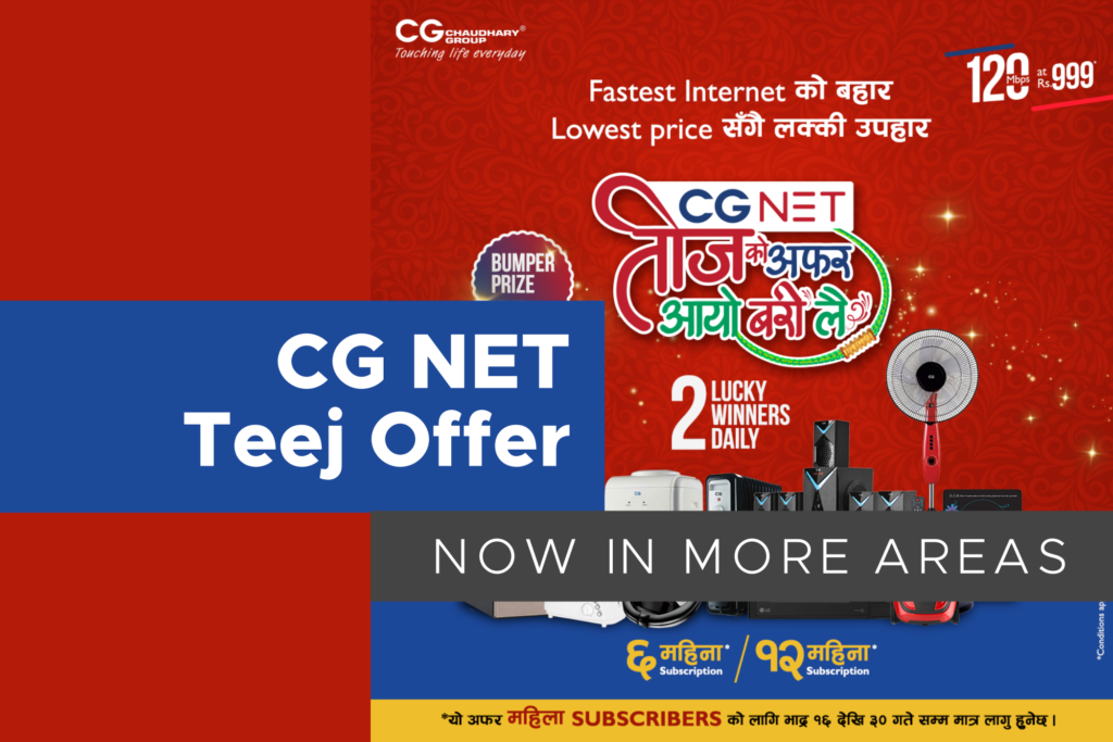 Offers CG NET Announces Teej Offer And Is Also Expanding Its Coverage Area Soon3 Mins ReadBy Dipesh Duwal On the auspicious occasion of Haritalika Teej, CG NET has introduced the “CG NET Ko Teej Offer, Ayo Bari Lai”…